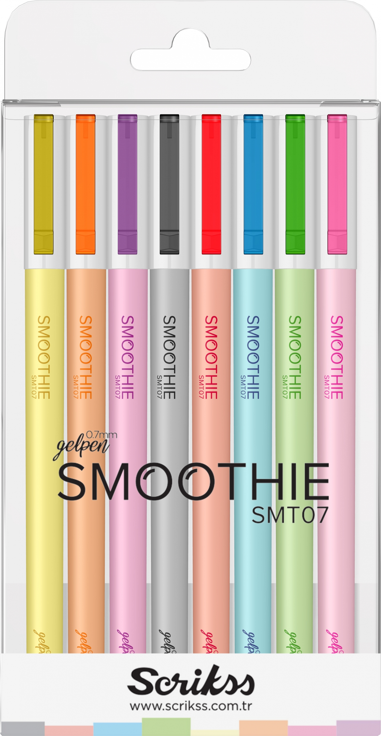 * Smoothie Jel Kalemler günlük hayatımızın en renkli parçası olmaya aday. Sekiz farklı pastel rengi ile yazılar renkleniyor. Scrikss Smoothie Kalemler 0,7 mm. uç kalınlığına sahip, hızla kuruyan jel mürekkebiyle yazı yazarken büyük kolaylık sunuyor.