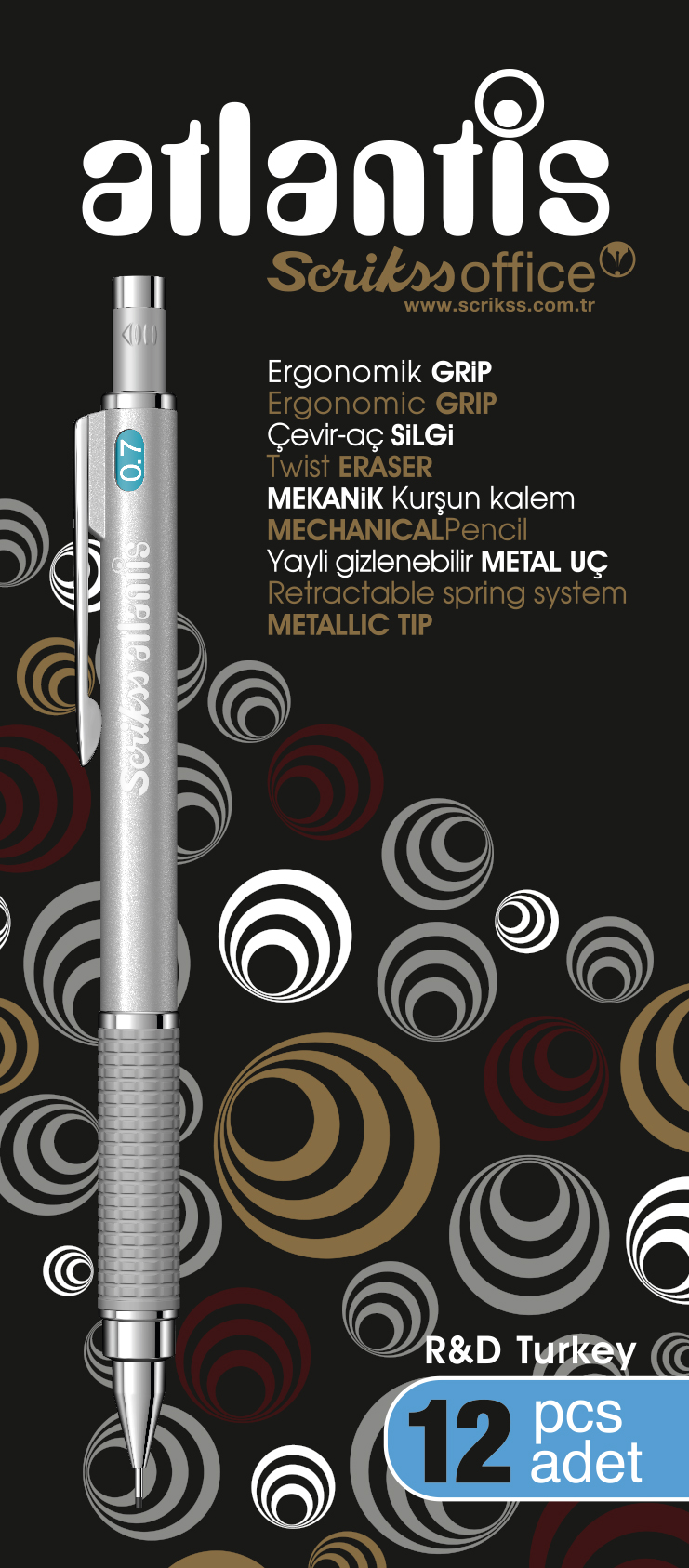 * Adını Atlantik Okyanusundaki efsanevi batık kıta Atlantis"den alan Atlantis versatil kalem; ergonomik tutuş sağlayan desenli kauçuk grip, krom kaplama klips,tepede çevirmeli silgisi ve geri çekilebilir uç sistemi ile oldukça kullanışlı ve pratik.