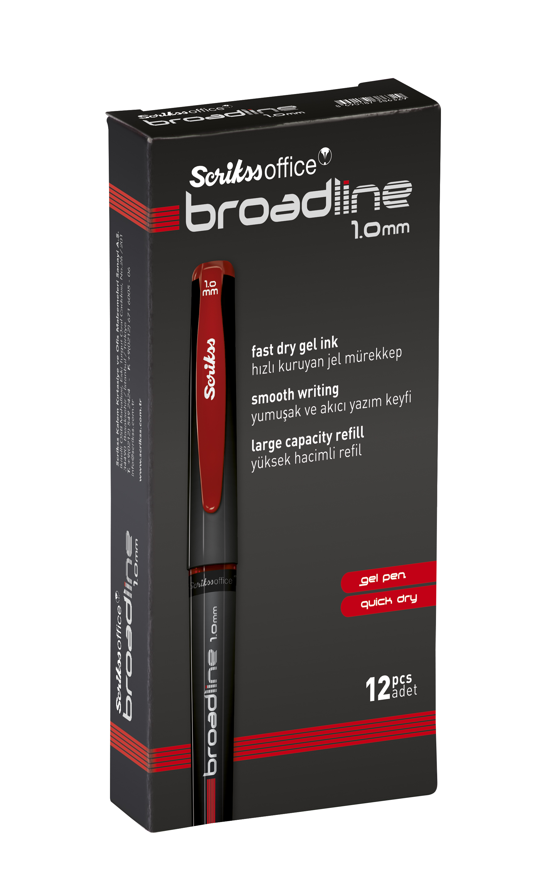 * Scrikss Office Broadline kalemler yüksek hacimli refili ve hızlı kuruyan jel mürekkebi ile yumuşak ve akıcı yazım keyfi sunuyor. Broadline jel kalemler; uç kalınlığı ve akışkan mürekkep kalitesiyle iş hayatında ve günlük hayatta rahat imza atmayı sağlıyor. 1 mm. uç kalınlığı ve jel mürekkebiyle yumuşak yazım konforu sunan Broadline kalemler, mavi, siyah ve kırmızı renk alternatifleriyle imzaları kalıcı kılıyor.