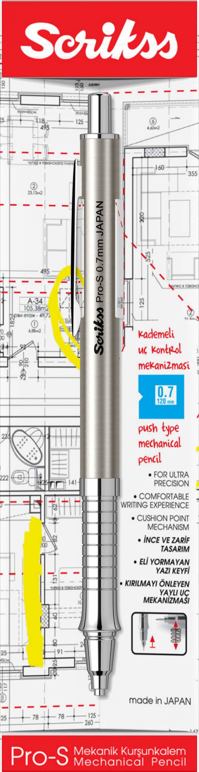 * Mekanik kurşun kalemde profesyonellik arayanların tercihi. Japon menşeli mekanik mekanizmaya sahip Pro-S; ergonomik tasarımı, mükemmel ağırlık dengesine sahip metal gövdesi yazma eylemini bir sanata dönüştürüyor ve aradığınız profesyonellği size sunuyor. Geri çekilebilir uç yapısı sayesinde taşıma esnasında metal uç zarar görmüyor. Profesyonel yazım ve çizim performansı arıyorsanız Pro-S tam size göre.